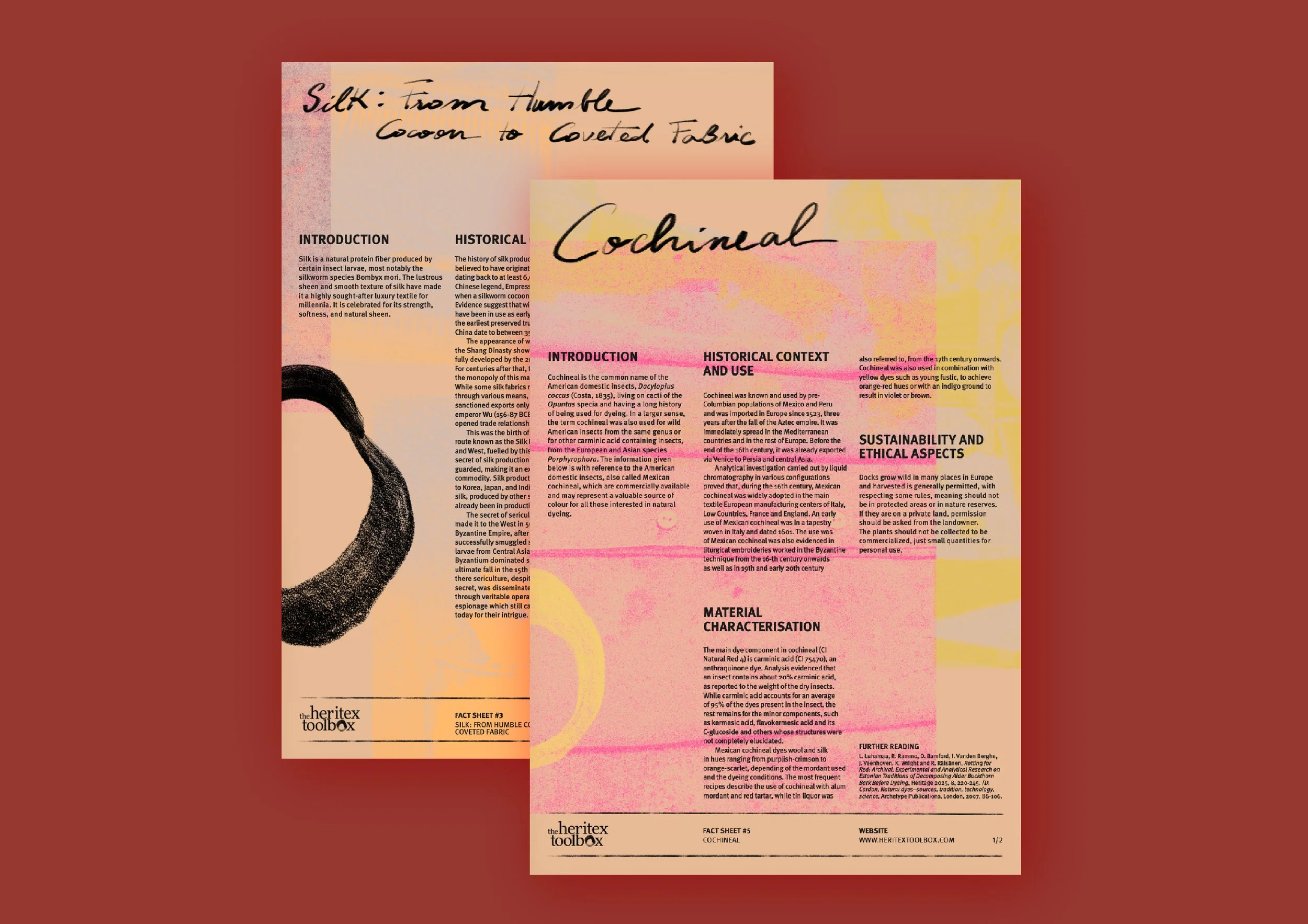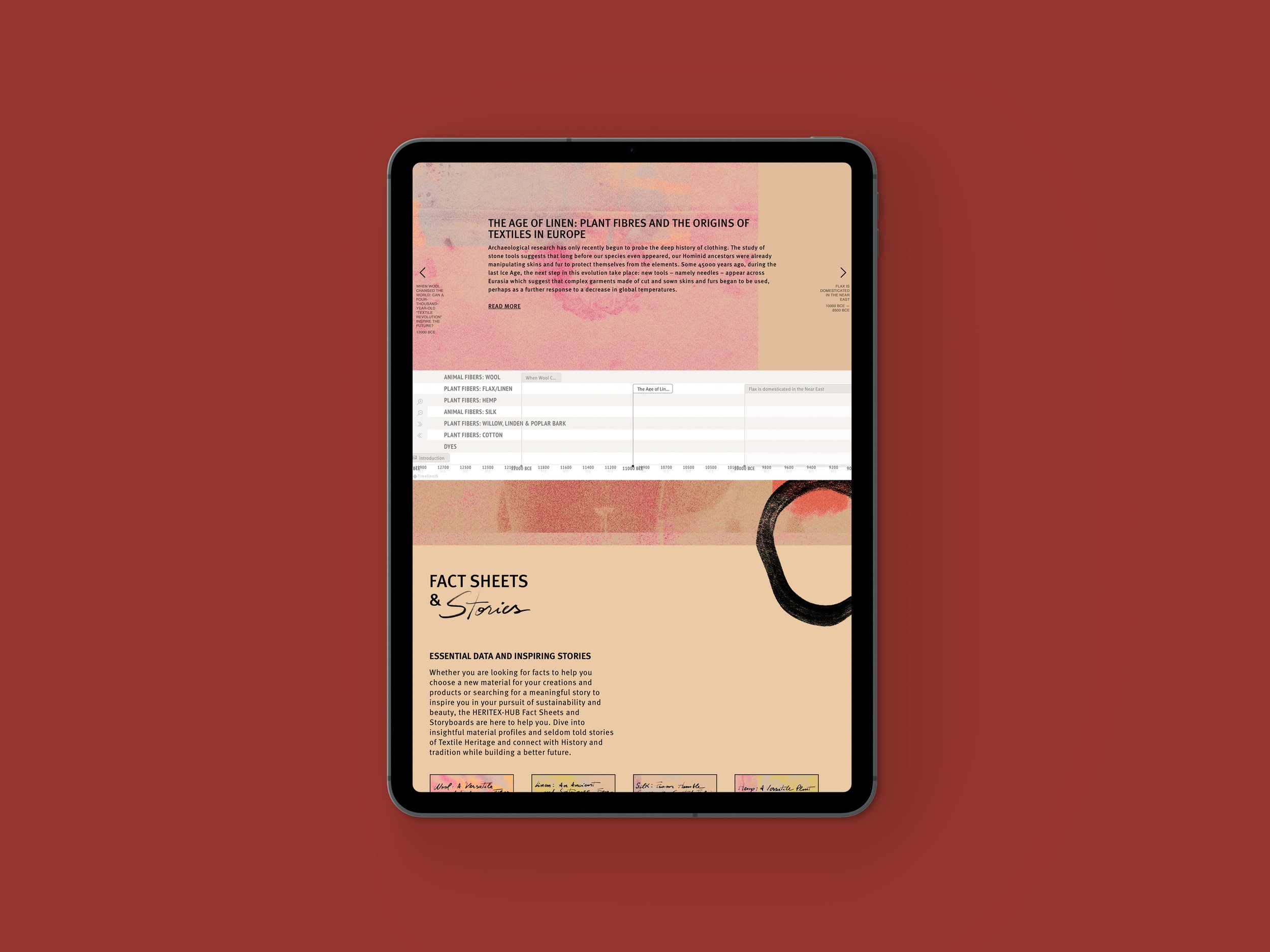 Within The Heritex Toolbox, we also created an interactive timeline spaning more than 10.000 years that allows users to navigate the development of natural fibres — such as linen, hemp, wool, silk, cotton — and trace how techniques, dyes, and traditions evolved across the globe and centuries, as well as fact sheets and an e-book.